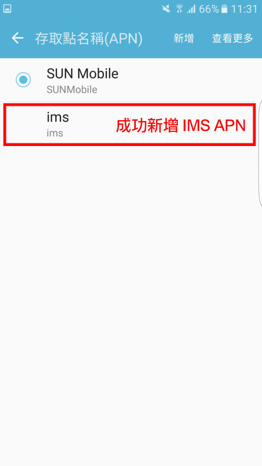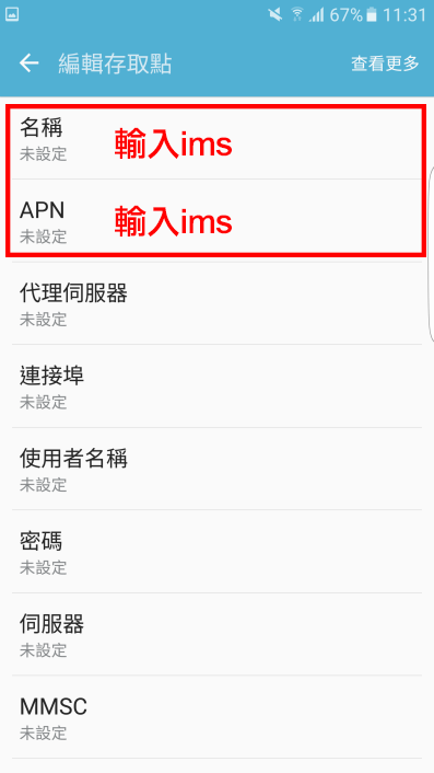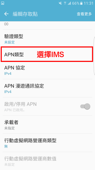 名稱: ims → APN: ims → APN類型: 選取IMS |